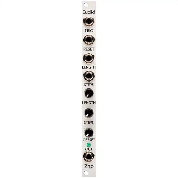 2hp Euclid is a rhythmic pattern generator based on ideas originally presented by Euclid, the Greek mathematician. The Euclidean algorithm can be adapted to create rhythms by taking the total number of active steps in a sequence, and then distributing them across the entirety of the pattern.