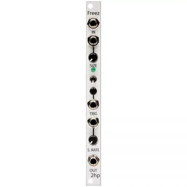 2hp Freez is a voltage controlled locked looper. It captures moments of audio in buffers, where they can be minced and mangled beyond recognition. Once frozen, adjusting size will cause pitch and timbre changes to the locked audio.