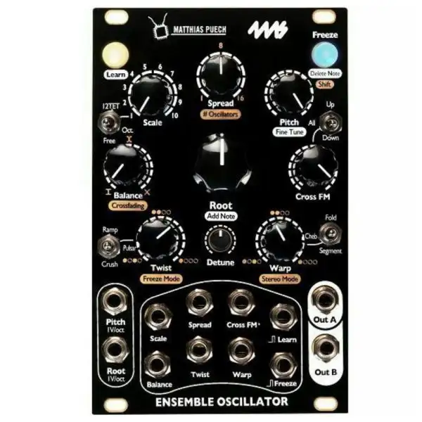 The 4ms Company Ensemble Oscillator is a unified polyphonic voice of sixteen complex oscillators combining additive, FM, phase-distortion and wavefolding synthesis techniques in new unorthodox ways. By quantizing the oscillators to scales or series of harmonics, the Ensemble Oscillator allows you to explore the sonic boundary between musical chords and rich evolving textures. Easily create a wide variety of sounds ranging from aggregates of pure sine waves to pulsar synthesis or pristine harmonic tones and lush wide chords to rich dirty drones and rumbling glitches. Custom scales can quickly be “learned” and saved using a CV keyboard or by manually entering notes with the controls.