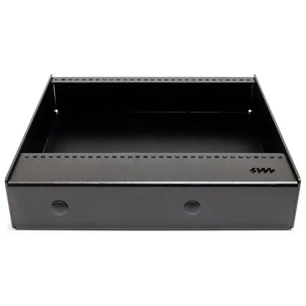 The 4ms Company Pod32 Unpowered is 32HP with 1.34″ (34mm) of available module depth. No power supply is included, you must supply your means of powering modules with a DIY power supply or a front-facing module such as the Row Power. Two holes on the rear face are plugged with removable plastic plugs, and can be used for DIY applications.