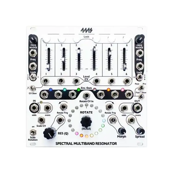 The 4ms Spectral Multiband Resonator is an innovative resonant filter which can process audio like a classic filter bank, ring like a marimba when plucked/struck, vocode, re-mix tracks, harmonize, output spectral data, quantize audio to scales, and much more… A gorgeous ring of colored lights displays the frequency of each filter, as well as the levels and current scale selection(s).