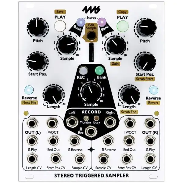 Each playback channel has a knob and CV jack for Sample File selection, as well as a Start Position knob and CV jack for controlling where in the sample playback will begin. The Length knob and CV jack determine how much of the sample is played back: from tiny grains, to percussive hits, to longer loops… or just the entire file. These are powerful tools for re-arranging a sample, joining multiple samples, and creating dynamically re-sized loops within a larger sample. Combined with the Play Trigger jack and the 1V/oct jack, the STS can be two complete multi-timbral pitch-tracked stereo voices!