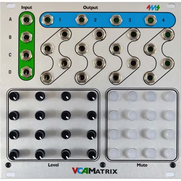 The 4ms VCA Matrix is a playable 4×4 matrix of 16 VCAs.
