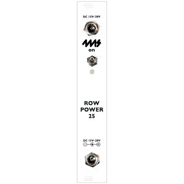 The 4ms Row Power 25 is a clean, regulated, and protected power supply module for Eurorack systems. It requires a barrel-style power brick (15 V – 20 V DC) and supplies power to modules via flying bus cables, direct connection, and/or bus boards.