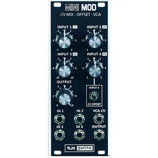 The AJH Synth MiniMod CV Mix-Offset-VCA is a compact 10hp wide Eurorack format module. It has been developed to offer a range of useful utilities for the MiniMod system and of course other Eurorack synthesizers. It comprises a four channel polarizing mixer, amplifier, inverter, a voltage source and a DC coupled VCA with switchable CV offset. Uses include mixing together CV modulation sources, mixing an offset voltage with a CV source, converting a bipolar ±5 V modulation into a unipolar 0 to +5 V