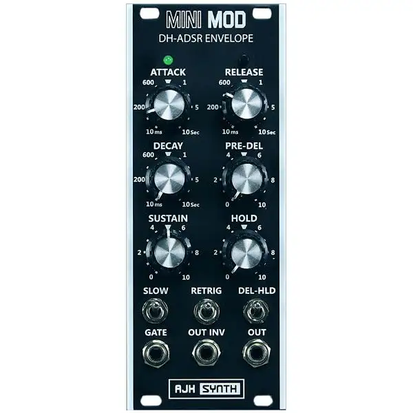 The AJH Synth MiniMod DH-ADSR Envelope Generator is a compact 10hp wide Eurorack format module. It has been developed to offer a full ADSR envelope for the MiniMod system and of course other Eurorack synthesizers, as an alternative to the original Model D style contour generators which do not have separate Decay and Release controls.