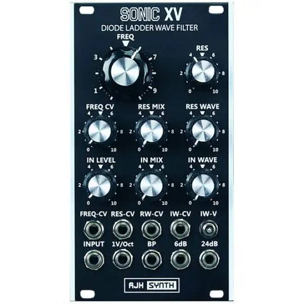 The AJH Synth Sonic XV Wave Filter is a four pole Diode Ladder Filter, featuring the circuitry and sound of the Musonics Sonic V synthesizer, which has a quite different character from transistor ladder filters. In addition to the regular 24 dB Low Pass output AJH have added a 6 dB Low Pass output and a Bandpass output, along with full voltage control of the resonance.