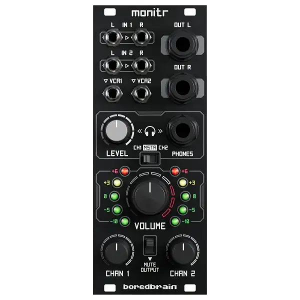 The Bordebrain Monitr is a comprehensive audio output monitoring utility for eurorack systems. The module is equipped with a stereo VCA-controlled input mixer with master volume control and VU meters, plus a powerful headphone section for both live performance and detailed monitoring.