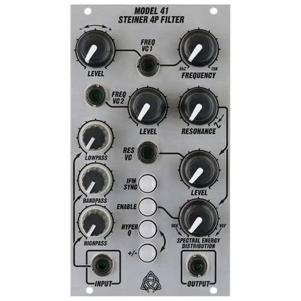 In June of 1992, Nyle Steiner designed an updated version of the filter found in his SynthaSystem, a revision that was never fully completed, and intended for his EVI. In the fall of 2008 the Model 41 began as a joint effort with Nyle Steiner based on this design and slated as a limited edition module to celebrate the 5 year anniversary of Plan B. As with other modules planned for that year, the M41 was never released.