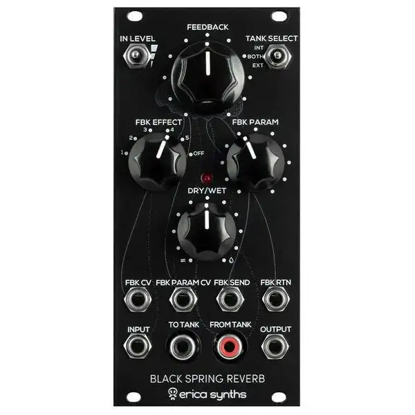 The Erica Synths Black Spring Reverb Eurorack Module is a different take on spring reverberation units. Firstly, it has a built-in vactrol based audio compressor, secondly, it can operate an external tank and combination of both internal and external reverb for effects unheard before. Thirdly, in order to animate the reverb effect, the module has built-in feedback effects – pitch shifters, delay, ring-modulator, etc; feedback amount and effect parameters can be controlled manually and via CV, making the module an experimental instrument on its own. The module comes with a compact spring reverberation tank which can be easily installed in most eurorack cases.