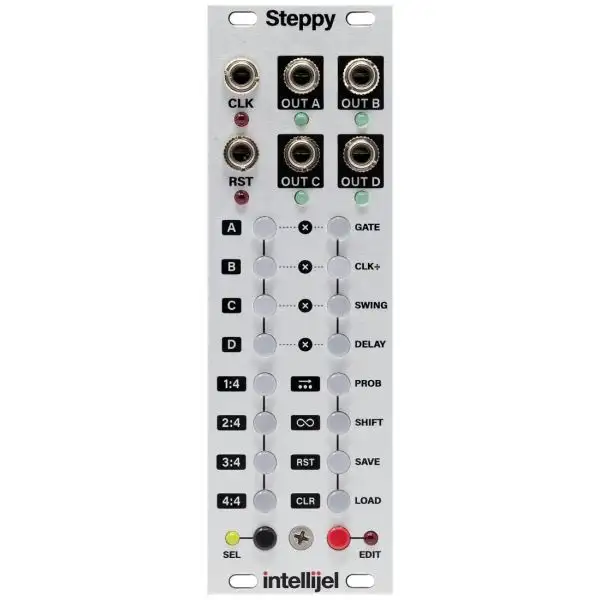 The Intellijel Steppy 3U is a 4-track programmable gate sequencer with eight internal memory slots, external clocking, numerous tweakable parameters, and a performance-first design aesthetic.