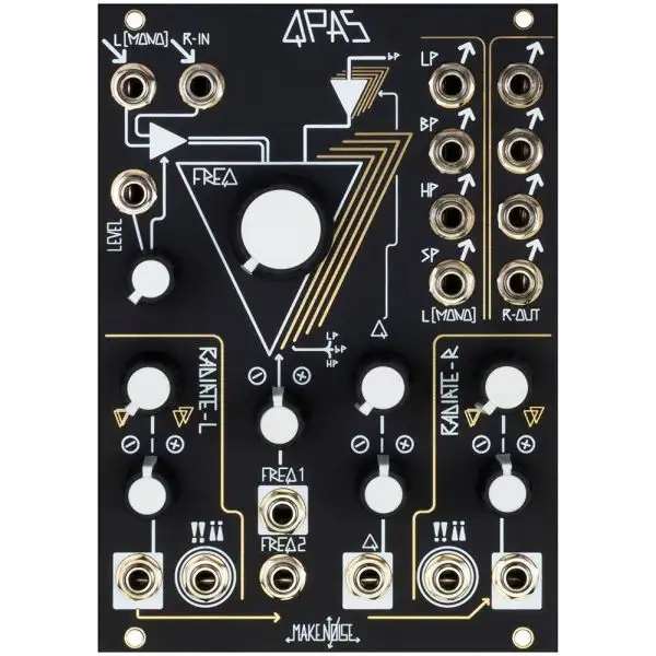 The Make Noise QPAS is a stereo multi-peak modular synth filter. Equipped with four identical state variable filter cores, QPAS uses advanced filter curves to create highly emotive synth sounds. QPAS combines the width of stereo spaced peaks with the movement of multiple filter peaks for truly hypnotizing effects. From simple Moog-inspired sounds to deep FM synthesis exploration, QPAS can do it all.