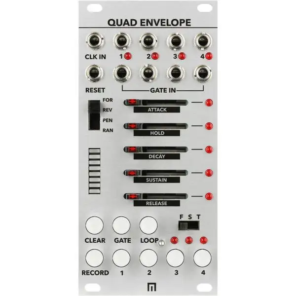 The Malekko Quad Envelope includes 4 individual AHDSR envelope generators with individual outputs as well as a 16-step automation sequencer per channel. Hold the RECORD button and move the sliders for Attack, Hold, Decay, Sustain and Release to animate each of these settings for a given channel. Autosave in stand-alone mode, or save up to 16 presets of these settings using Varigate 4+ or up to 100 presets using Varigate 8+.