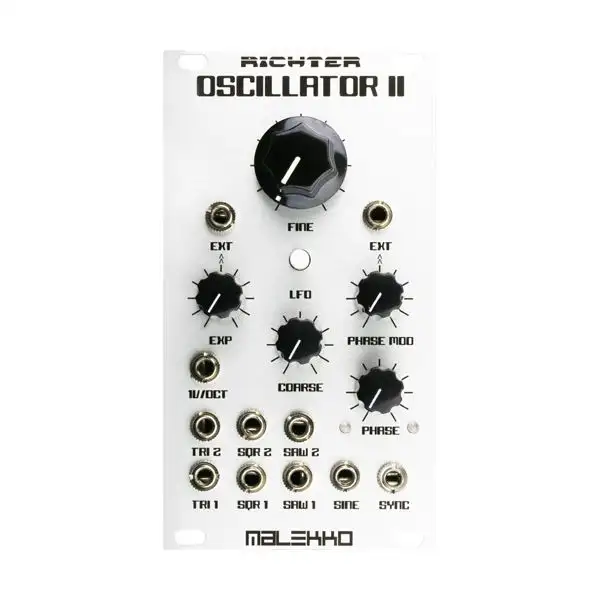 The Malekko/Richter Oscillator II is a great-sounding, solid analog Oscillator/LFO with some serious tricks up its sleeve.Fine and Coarse frequency controls are provided. Volt per octave and exponential (with attenuator) CV frequency inputs are provided. An output for each waveform is provided (Sine/Triangle/Square/Saw). A second series of outputs are provided for phase-modulated versions of the Triangle, Square, and Saw waveforms. The phase of the 2nd series of waveforms is determined by the Phase control, along with the Phase CV input (with attenuator). Many great modulation effects can be produced by using the various outputs of this Oscillator in a patch. Push the LFO control switch to enter low range, and your Oscillator becomes a phase-modulated LFO! Set the 2nd series of outputs to a 90 degree offset and use external inverters to achieve full quadrature output.