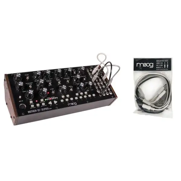 Mother-32 comes secured in a rugged extruded aluminum enclosure with wood sides and features a voltage controlled 32-step sequencer with 64 sequence locations, definitive Moog low pass and high pass Ladder Filter, 2 voltage controlled mixers, a classic Moog oscillator with dual outputs, wide-range LFO with audio-rate modulation capability, MIDI input and MIDI to CV conversion, white noise, a modular patchbay with 32 patch-points for extended synthesis complexity and an assignable CV jack with 16 assignable sources.