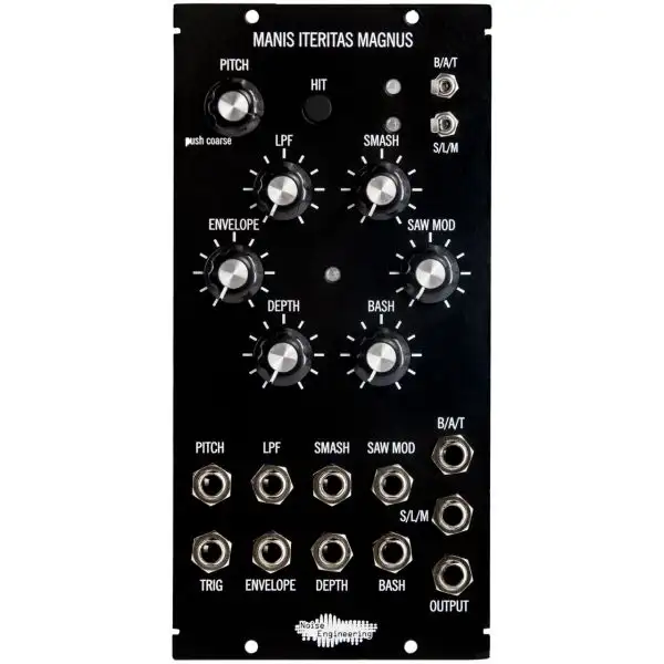 The Noise Engineering Manis Iteritas Magnus is a 5U voice based on the architecture of Basimilus Iteritas, but designed to be more gritty and aggressive. It accomplishes this by producing only sawtooth waves that are manipulated, modulated, and distorted through a rethought interface. Manis is suitable for leads, bass lines, drums, darkness, detuned madness, or pure mayhem.