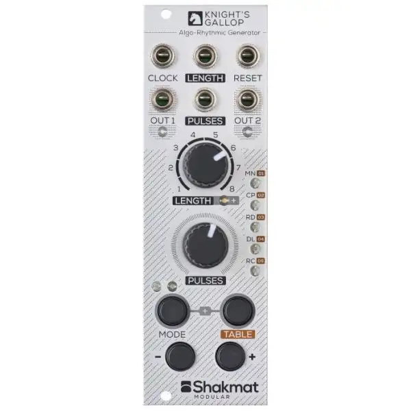 Two outputs and five different rhythmic flavors multiply by a load of “algo-rhythmic” processing to result in a practically infinite number of polyrhythms. That’s the fundamental formula that produces the Shakmat Modular Knight’s Gallop principle: a dual trigger generator providing sequences according to tables and modes.