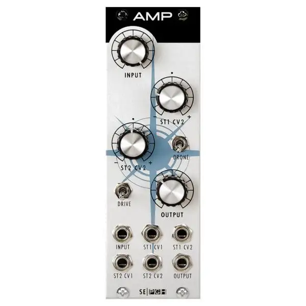 The Studio Electronics AMP is a 2 stage Class A discrete design using 3 pairs of hand matched transistors. Envelope is usually applied to ST1/1. ST1/2 goes thru an attenuverter and can be used for envelope or modulation. ST2/1 goes to the 2nd stage, and is typically used for volume control. ST2/2 goes thru an attenuverter and is typically used for modulation.