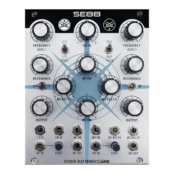 The Studio Electronics SE88 is their version of the boxy, Blade Runner-sweet and Boomstar-brash dual mode CS80 filter, initially married to the Omega Series Synths, and then tucked-in the ‘Stars, now joins the Modstar Collective. They twisted and turned the SE88 to unflatten the earth, so to speak; the original CS80 fed a HP filter into a LP filter, but with the SE88 your can select MODE 1’s HP or BR to feed MODE 2’s LP or BP, or patch it to reverse that pleasant path. The audio signal is completely controllable with input and output levels for each filter. Cherish and respect your filter’s input gain stages, for a smooth yet often brassy soundβshed your mercy to strike hard for boiling, snarling bite, even to the blackout/cutout point (see Greg St. Regis, Tim Caswell, and Marc St. Regis’ SEM filter commentary for a detailed diatribe on this “feature too far”); then and only then, uniquely blend mode settings for the filter family values you revere.