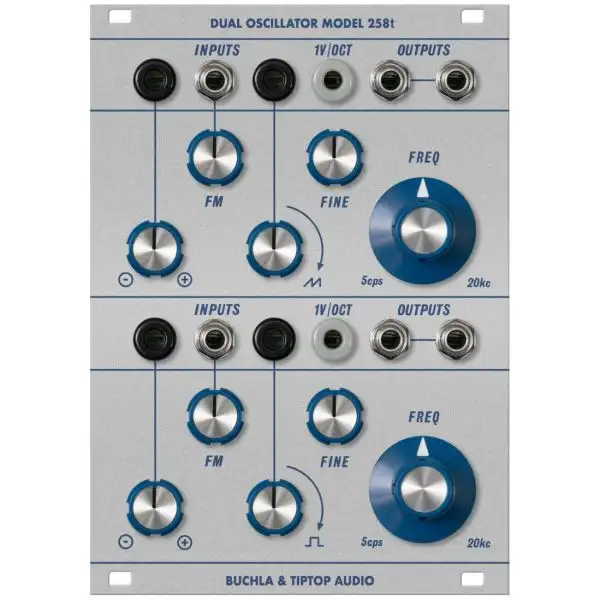 The Tiptop Audio Buchla Model 258t features two independent voltage-controlled oscillators. Each has one processing input, a frequency modulation input and a 1V/oct input. Waveshapes, as well as frequency, can be voltage controlled. Model 258 oscillators feature low sine wave harmonic content, negligible settling error, and high short and long-term stability, even with rapidly changing ambient temperatures.