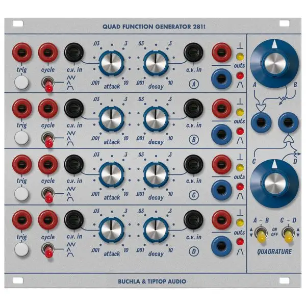 The Tiptop Audio Buchla 281t Quad Function Generator comprises four function generators organized in two pairs. All four generators can operate independently or can be linked in pairs to generate more complex output voltages.