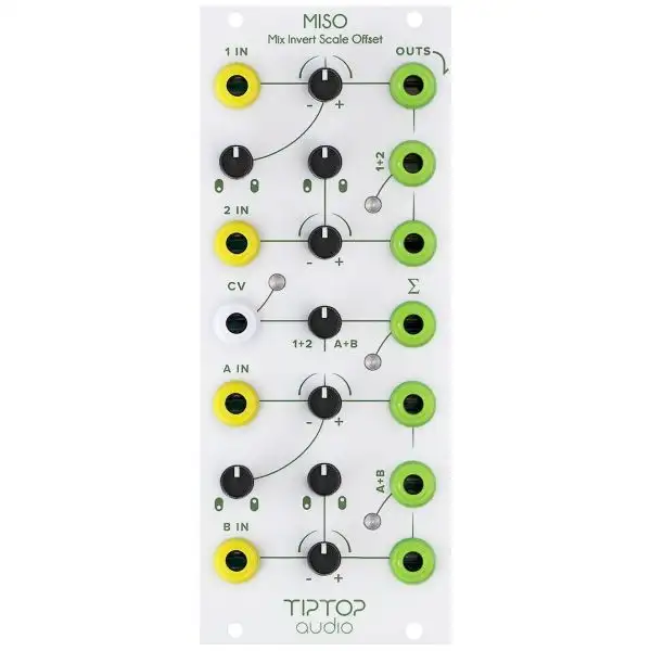 The Tiptop Audio MISO CV Modulator is a multipurpose utility module, a laboratory for synthesizing control voltage signals and audio. MISO combines multiple CV tools into one module for making complex CV shapes at the output stage. The name comes from the the four main functions available: Mix, Invert, Scale, and Offset.