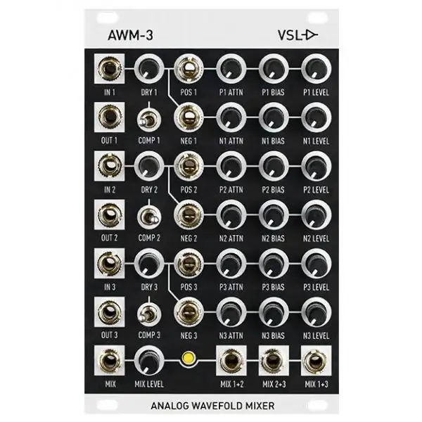 The Vintage Synth Lab AWM-3 is an all analog, real-time, complex wave-shaping (triple wave-folder) 3-channel mixer module with added features of compression and multiple mix modes including matrix mixes. The combination of multiple access points (outputs of various mixes), wave-folding, and compression allow for an extremely wide array of signal processing, including complex chorus-like sounds.